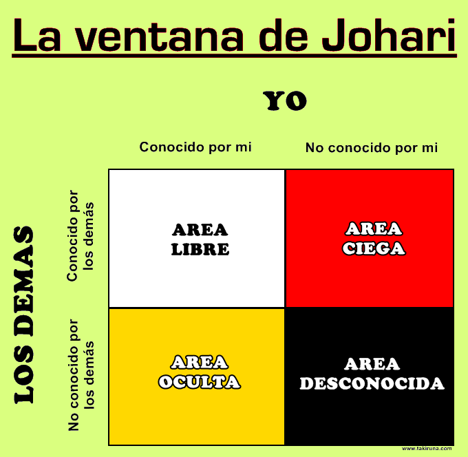 Autor: Psic. Arnaldo QuispeLa ventana de Johari es una de las herramientas de la psicología moderna más útiles y difundidas en el quehacer terapéutico mundial, creada por los psicólogos Joseph Luft y Harry Ingham, sus aplicaciones se extienden a la psicología comunicacional, la psicoterapia cognitiva, las dinámicas de grupo, el desarrollo personal y corporativo. Este modelo explica el proceso dinámico de retroalimentación de la información (dar y recibir feedback) que llega a partir del conocimiento de uno mismo y de los demás. De modo gráfico la ventana de Johari se ilustra con un cuadro de doble entrada dividido en cuatro cuadrantes resultantes de la combinación de variables cambiantes como: conocido por mi, no conocido por mi, conocido por los demás y no conocido por los demás.