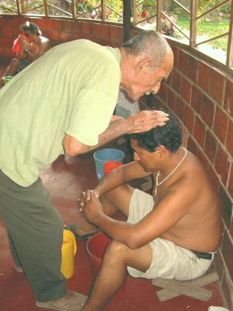 Mama Rosa, mujer de medicina, muy intuitiva, seguramente había percibido que algunos de los convidados posiblemente la pasaba mal y fue por esa razón, que me llamó para recibir la curación del maestro, motivo por el cual tendría que ingresar dentro del circulo sagrado y ubicar en la oscuridad el camino que me conduciría en frente del maestro. Al principio mi cuerpo estaba muy débil y desorientado y no lograría responder el llamado de la maestra asistente. Ella insistía y me llamaba “Arnaldo acércate, Arnaldo ¿puedes venir?, Arnaldo ven para acá…”, yo comenzaba a identificar esa voz familiar y gateando trataba de encontrar de donde provenía. De la mano acogedora de esa mujer de medicina logré finalmente ubicarme en frente del maestro. Pero aún estaba lejos de su alcance, a pesar que lo veía gigante y fuerte como en visiones anteriores, esta vez fue el propio viejo Solón el que terminaría por acercarse y comenzar su ritual de sanación. Era el momento apropiado, me cantó un icaro que jamás podré olvidar, cantó y cantó por mucho tiempo, pues para los grandes maestros el tiempo no existe. Con los masajes y golpecitos de su shacapa de ruda, recobraría de a poco la orientación en el mundo de la realidad ordinaria. Las sopladas del mapacho negro y el agua florida sellaron el trabajo de curación. Cuando recobré el conocimiento me dí con la sorpresa que me encontraba casi en el medio del círculo sagrado y que la sesión prácticamente había sido dedicada a mí. No llamaron a nadie más. Yo estaba muy feliz, en un estado de paz y armonía interior, luego de haber retornado de ese viaje al mundo de los espíritus.