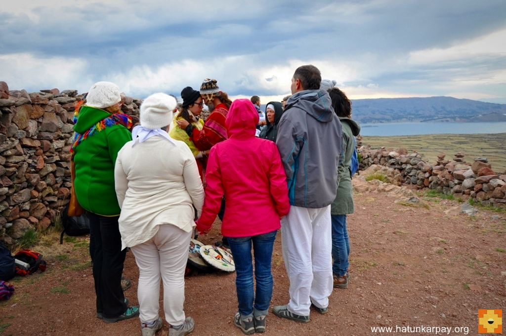 Con las piedras en mano formamos unas tres apachetas en el sendero a la cima, previos para dar agradecimiento a cada uno de los reinos del mundo andino, de ese modo y con el permiso en mano entramos al templo más importante de la isla, dedicado a Pachatata, deidad andina que no viene a ser otra cosa que la presencia del Tata Inti en la pachamama. La cumbre donde se ubica el templo se ve como una pirámide desde lejos, lo cual permite que el Sol despliegue todo su poder por cada uno de los lados cardinales del Lago, de este modo la energía se distribuye convenientemente para la salud del entorno ecológico. La punta de la pirámide conformada por la base del templo a Pachatata es el conector de energía emanada desde su propia fuente el Tata Inti.