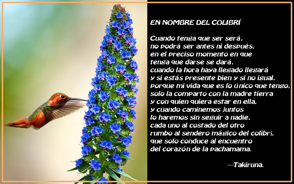 Te giras de una parte o de otra y de repente te dices a ti mismo «el momento ha llegado», sin motivo alguno cojo el ordenador y escribo en blanco y negro el pensamiento que gira en mi cabeza desde hace ya algún tiempo atrás, esta vez no hago correcciones y la única curiosa dificultad fue encontrarle un título al final, creo que esta etiqueta fue el punto más artificial de esta plegaria, que a mi modo de ver solo pudo descubrirse una vez terminada. Mi ser interior me dice que representa el llamado del colibrí que todos tenemos dentro y que al despertar declara su incólume trascendencia y camino de transformación con un claro propósito: responder al llamado de la madre tierra, para conectarse con la diosa pachamama.