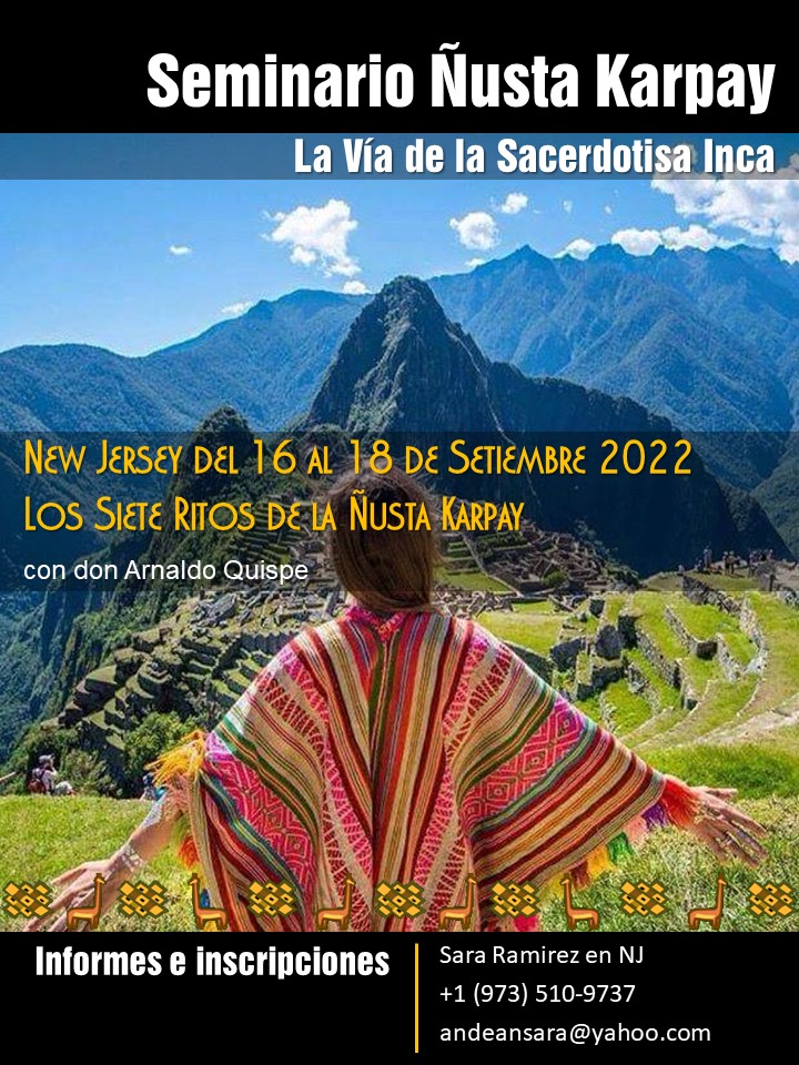 Seminario experiencial sobre la SACERDOTISA INCA. Algo que se conoce en el contexto místico andino como ÑUSTA KARPAY. Esta tradición nos llega gracias a las enseñanzas del maestro paq’o andino de origen Q’ero Don Mariano Quispe. El evento de fin de semana será la segunda entrega de esta temática ya ofrecida en el año 2019.