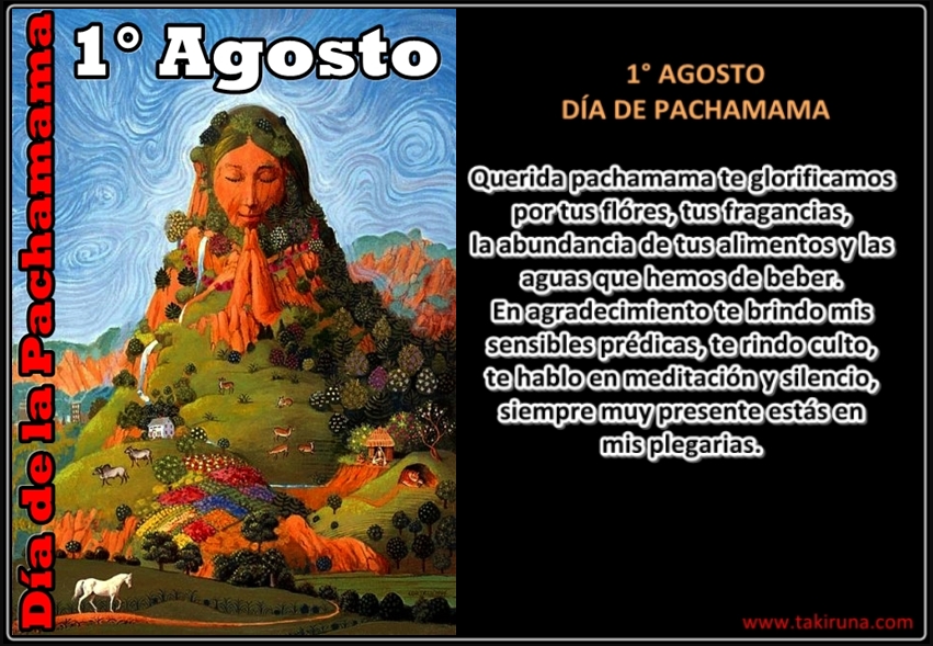 Querida Pachamama, tú que reinas en el universo con la inteligencia del sano equilibrio, escucha a tus hijos, intercede por nosotros con los grandes vientos, habla con el agua, con el fuego y con la tierra.