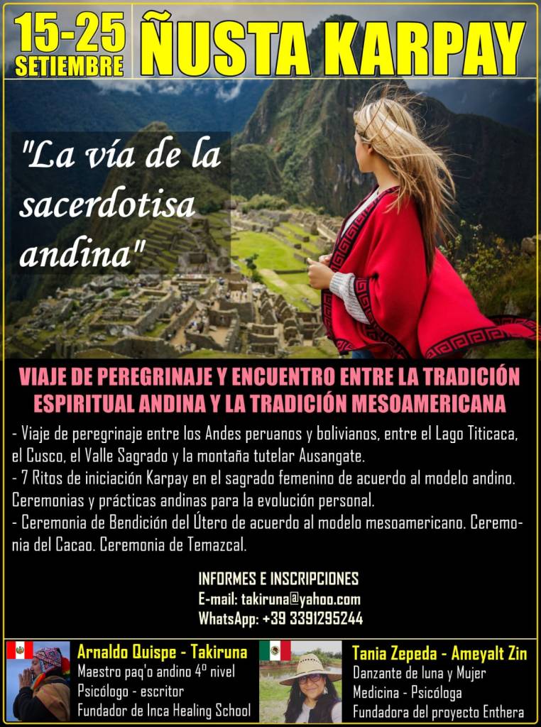 La Vía de la Sacerdotisa Andina (Ñusta Karpay) es un viaje iniciático compuesto por experiencias, intenso compartir y siete ritos íntimamente dedicados a la autosanación y la integración humana. Este viaje de retiro espiritual permite reequilibrar la relación energética entre masculino y femenino.